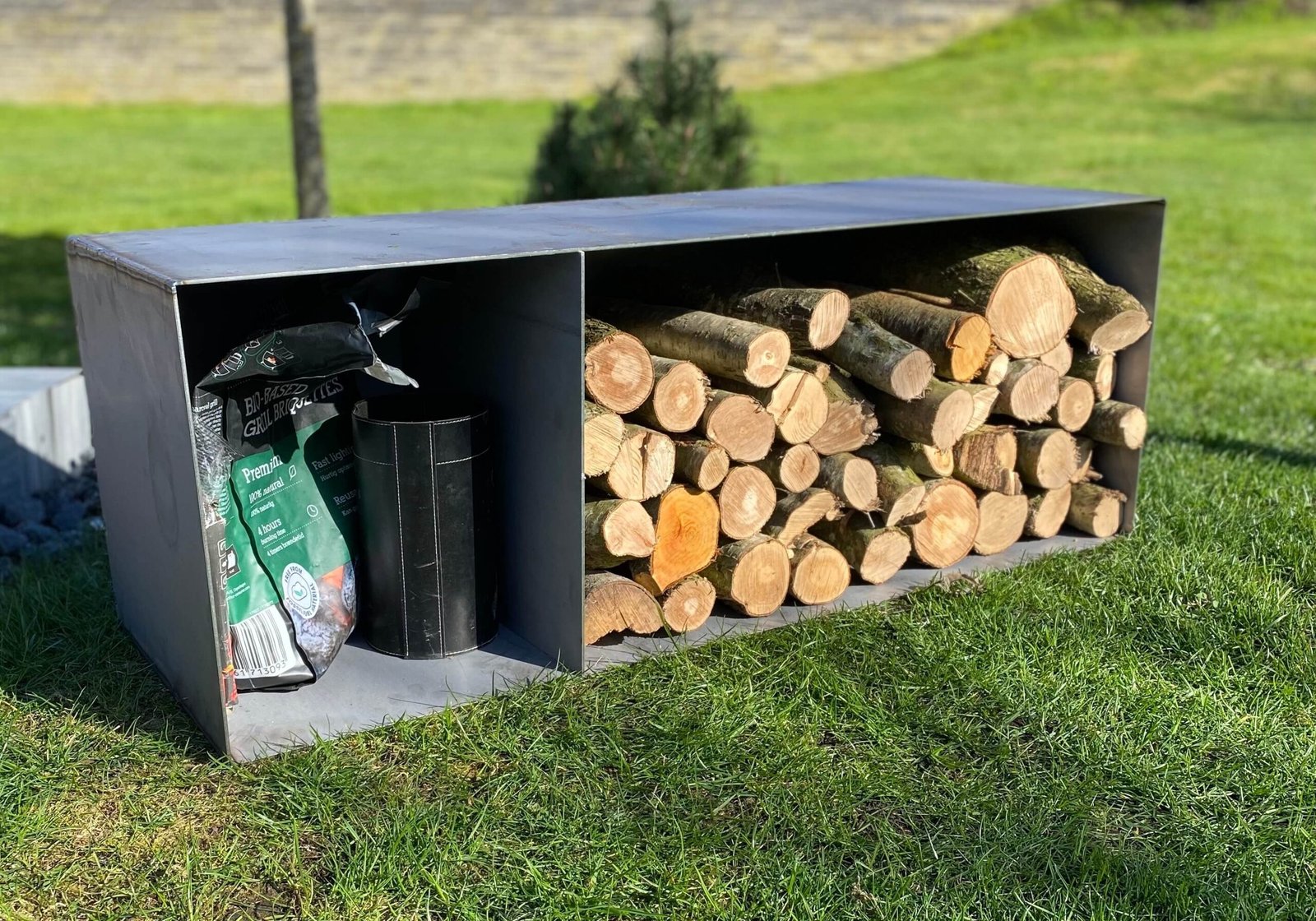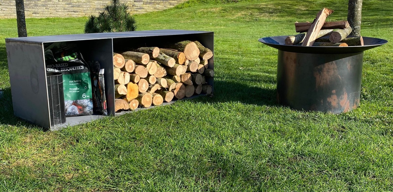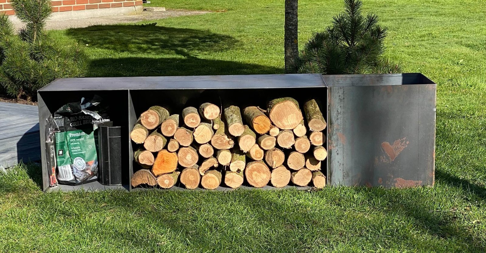 Fuldsvejst brændeskjul i sort stål eller corten stål – robust og stilren løsning til opbevaring af brænde udendørs.