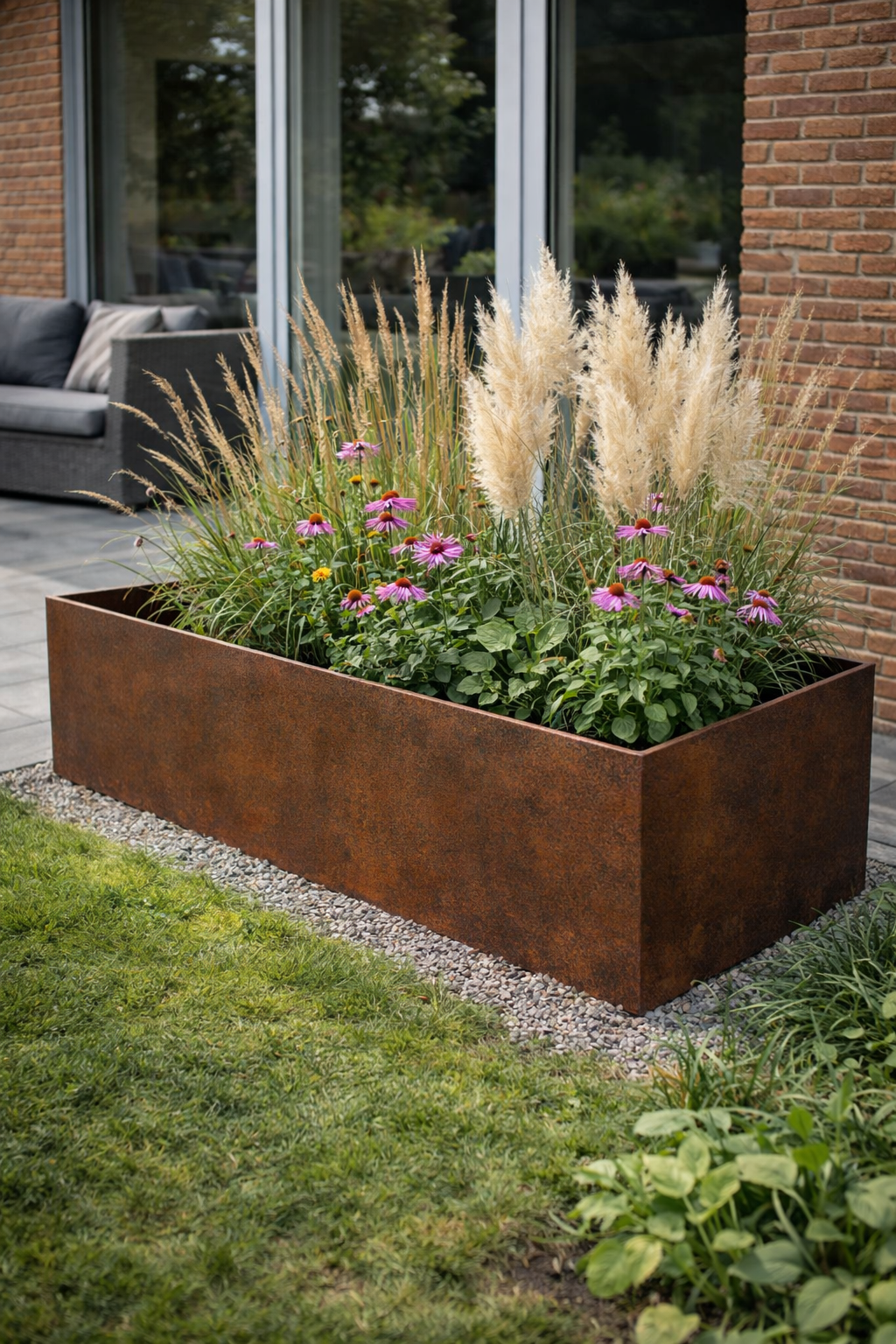 Dette corten højbed er en stilren og holdbar løsning til haven, terrassen eller udendørs projekter. Vores plantekasser fremstilles i massivt 3 mm cortenstål og er fuldsvejst i alle samlinger for maksimal styrke og lang levetid.